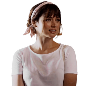 SCARS: rectangle patch on left inner forearm, six inch long gash running from her wrist upwards on right inner forearm, two inch long laceration parallel to aforementioned scar on right forearm, one inch horizontal scar above right eyebrow, horizontal slanted scars on either hip/lower ribs, curved surgical scarring on left side of skull (concealed by her hair)